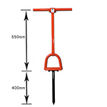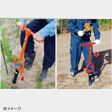 柔らかい所は足踏みで、堅い所は木槌で打ち込むことができる下穴・追肥穴あけ器。中央のステップに足をかけ、体重を利用して押し込めるので、効率よく穴あけができます。(日本製)