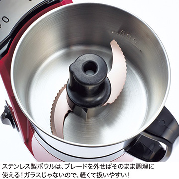 ボウルは強くて衛生的なステンレス製。ブレードを外せばそのまま調理用ボウルとして使えるので、料理道具が減らせる。つまり洗い物が減らせる。ボウルのまま冷蔵庫に入れたり、温かい食材、液体、氷など、幅広い用途が特長。また、一般的な製品で使われるガラス製のボウルだと、重くて、洗うのもしまうのも割れないように気を付けて大変。だけどこれはステンレス製だから軽くて、使い勝手がすこぶるいい。