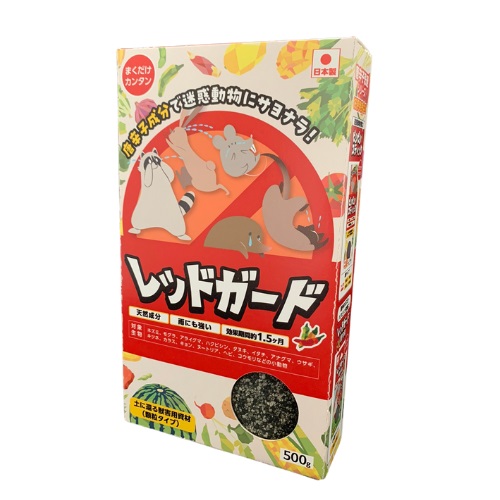 天然ゼオライトに速効性と遅効性タイプのカプサイシンを配合。被害箇所や動物の通る道に散布するだけです。また、保水性と保肥力の高い天然ゼオライトなので使用後は土壌改良にも役立ちます。(日本製)