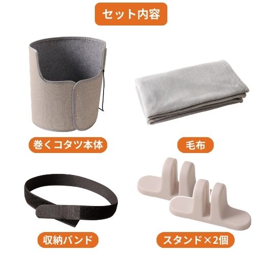 巻くコタツ本体、 スタンド×2個、毛布、 収納バンド