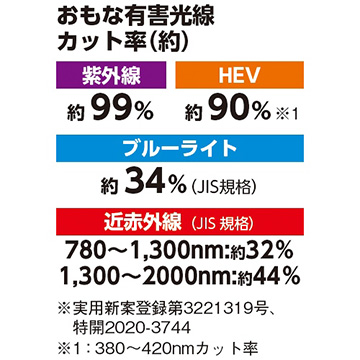 有害光線を吸収する特殊なレンズを用いており、眼病の一因とされる紫外線、HEV(高エネルギー可視光線)、ブルーライト、近赤外線から目を守ります。可視光線透過率約76%の薄色レンズのため目に入り込む光量(有害光線)を減らし、負担を軽減します。フレームとレンズは丈夫なポリカーボネイト製。(日本製)