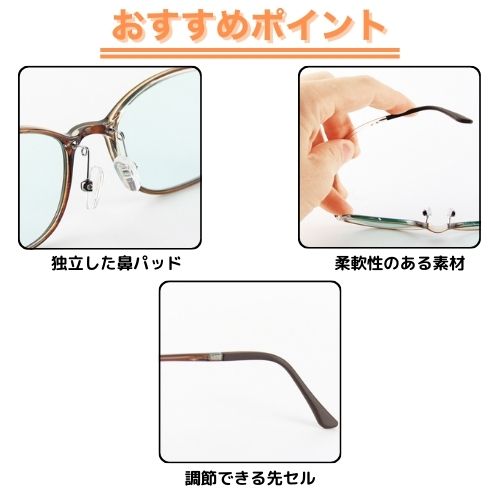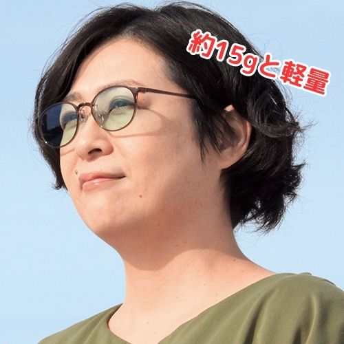 目に有害とされる紫外線・ブルーライトをカット。薄色なので室内でも長時間かけられます。レンズに吸収剤を練り込んでいるので、有害光線を吸収。フレームの形は丸みを帯びた「ボストン」タイプ(日本製)