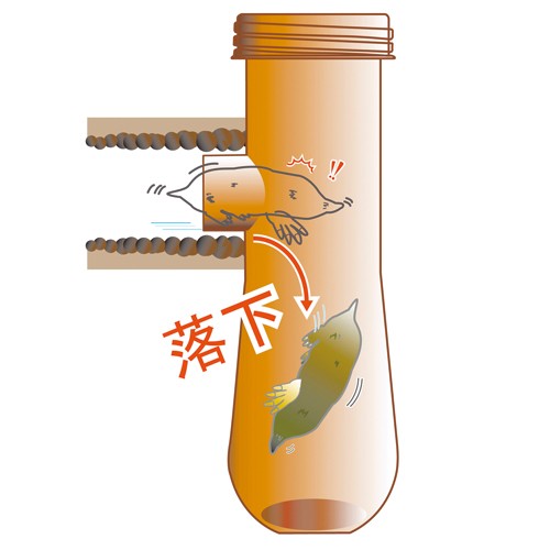 モグラの通り道に仕掛けて捕獲します。一度落ちたら這い上がれず、傷つけることなく捕獲することができます。捕獲器の入り口はモグラの掘る穴にあわせて侵入しやすいように楕円形になっています。(日本製)