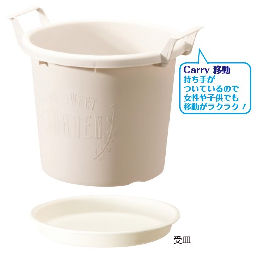 園芸番組でも使われた持ち手つきのプランター。移動がラクにでき、果樹・バラ・観葉植物・野菜の大鉢栽培にオススメです。受皿はフタとして収納にも使えます。(日本製)