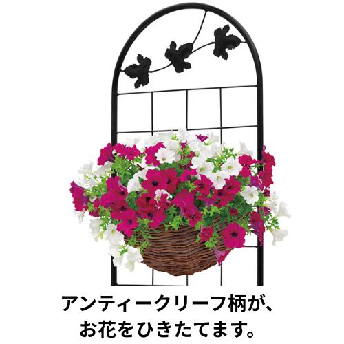 アンティークリーフ柄のハンギングスタンドでハンギングバスケットを掛けて楽しめます。またスタンド部には鉢植えが置けます。玄関前などを飾るのにぴったりです。(中国製)