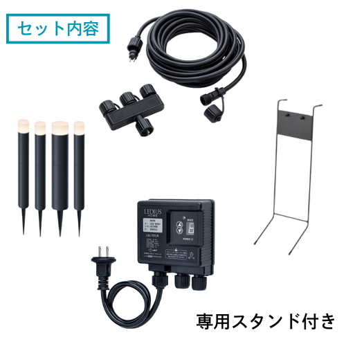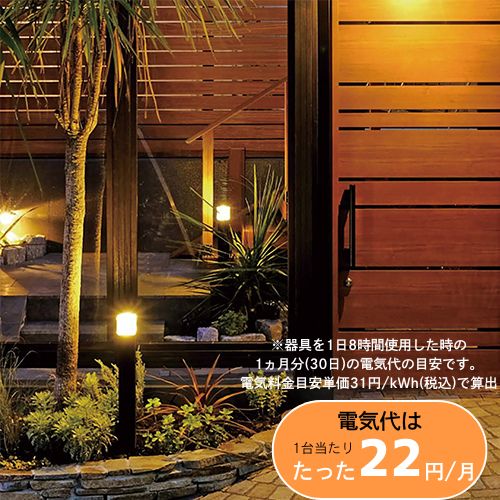 やさしい光が足もとを照らし、ホッと落ち着く空間にします。屋外コンセント1つで自在にライトアップ。100V の電源からローボルトに変圧するので電気工事士の資格がなくても簡単に設置できます。(中国製)