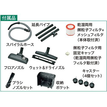 付属品:スパイラルホース、延長パイプ、乾湿両用微粒子フィルタ+メッシュフィルタ(本体取付済)、フロアノズル、ウェット&ドライノズル、ブラシノズルセット、収納ポケット、微粒子フィルタ用固定キャップ(乾湿両用微粒子フィルタ取付済)、キャスター(4個セット)