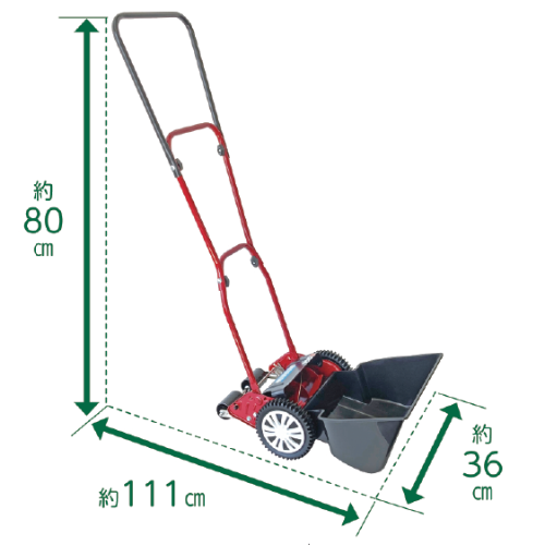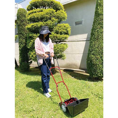 使い方がとても簡単な芝刈機!押しながら歩くだけ!住宅街のお庭でもご使用いただける静音設計です。集草器が前面についているので、歩行の邪魔をしません!(日本製)