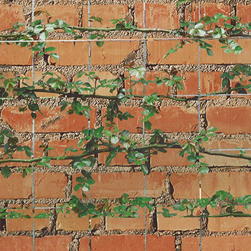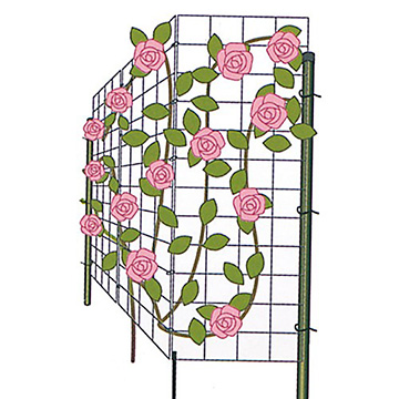 つるバラや朝顔などのつる性植物を絡めて栽培するメッシュパネルです。誘引作業がしやすい、目合い15cm角で、さびにくく軽量。すでに植栽されている場所にも、ほとんど根を傷つけることなく設置できます。別売りのトカイッコ(専用脚部)を使用すれば、ベランダにも設置できます。(日本製)