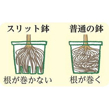 スリット鉢だけの販売。スリット鉢とは、たてに細長い穴(スリット)を数カ所開けたプラスチック鉢で、鉢底に渦巻状の根(サークリング)を形成せず、根を均等に張らせることができます。(日本製)