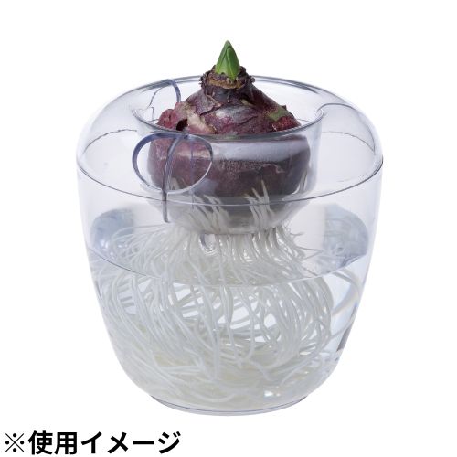 上部には球根が落ちないような支持部があり、ヒヤシンス特大球(球周18cm程度)に最適なサイズです。支持部はカットすることも可能なので、発根部が大きいサボテンなどの水栽培も楽しむことができます。上下が別々に分かれるため、簡単に水の交換ができます。上部に穴も空いているため、水が減った場合はそこからも給水ができます。(日本製)