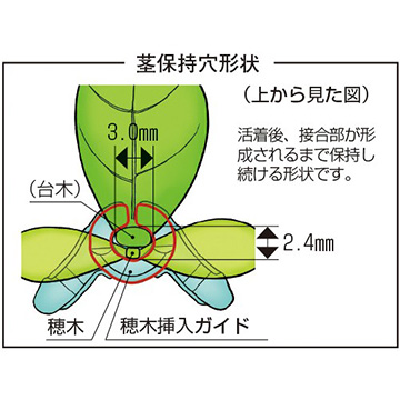 キュウリなどウリ科の片葉合わせ接ぎに使いやすく、接合部がきれいに仕上がります。透明なので切断面の合わせや接合状態を容易に確認ができ、摘み部は指先で摘み開く時に使いやすく、持ちやすい形状になっています。(日本製)