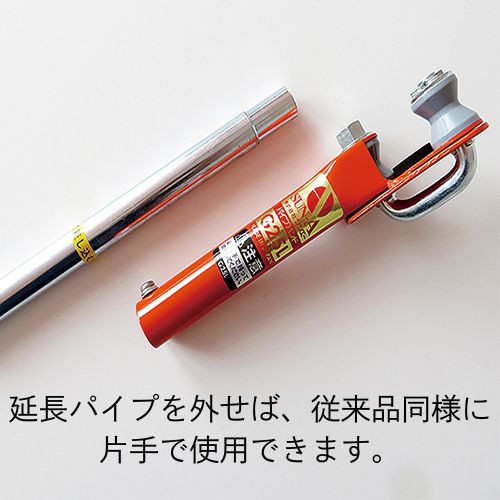 持ち手が長くなり両手で使えるので、従来品よりも力を加えやすいです。固い地面へのパイプや支柱の抜き差し作業が楽にできるようになりました。本体も強化され、従来品より強い抜き差し力に耐えられます。着脱できる延長グリップを外せば、従来のパイプハンド同様に片手でも使えます。