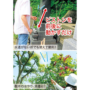 水や消毒剤の入った市販のバケツやポリタンクに本品のホース下部取水口を入れ、手元の放射部分を引いて押すだけ!従来の噴霧器では届かなかった高い所にも届くので樹木の水やりや消毒にも好適です。水流は霧と直線の2種で、直線はジェット水流としてお掃除にも好適です。バケツに洗剤を入れて洗車にも使えます。(日本製)