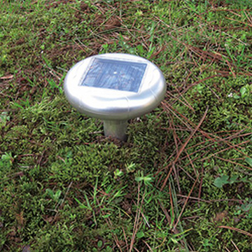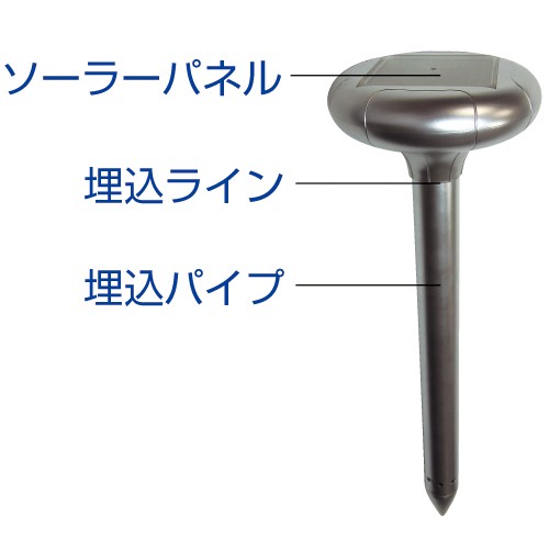 地面に埋め込むだけ!自動可変式で、音波の周波数や鳴るタイミングを自動的に変えることができモグラの慣れに対しての効果効能が持続します。埋込パイプの6カ所の貫通孔により、音波振動を効率よく伝え、ソーラーパネル出力の蓄電で長い時間作動します。(中国製)