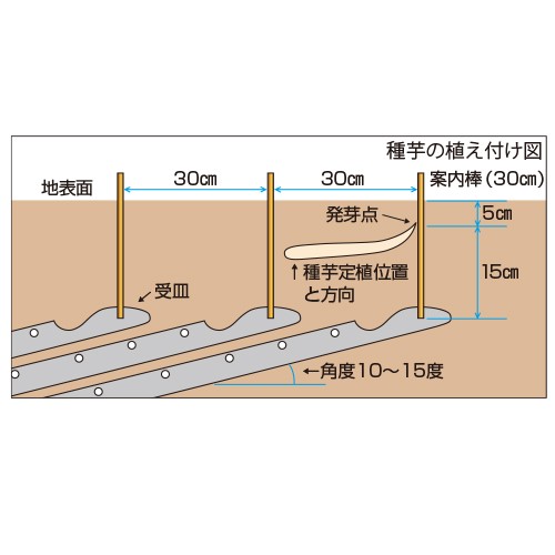 ・案内棒はパイプ受部の中央に立て、種芋の植え付け(定植)場所の目安とします。