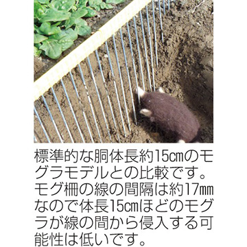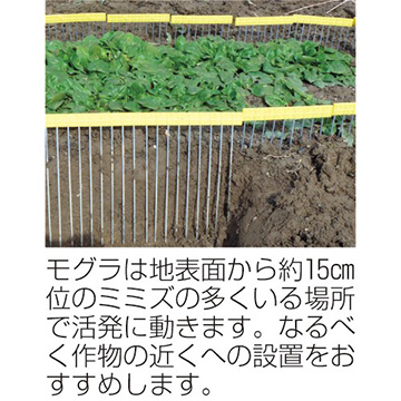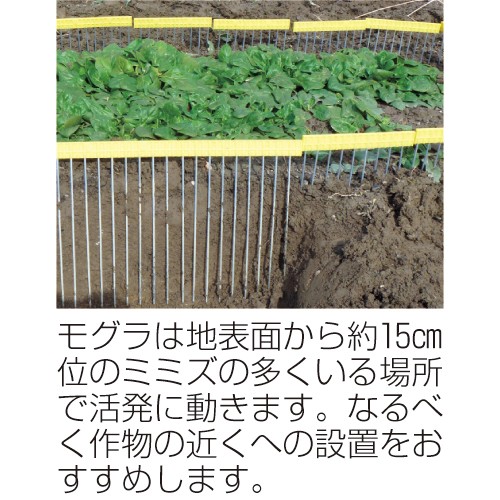 作物などの周りの地面に刺すだけの簡単設置で、モグラの侵入を防ぎます。薬剤などを使わずにモグラの侵入を妨げられます。侵入されたくない場所に隙間なく囲むように設置すると効果的です。(日本製)