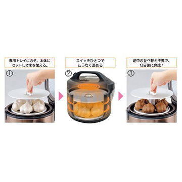 家庭用「熟成黒にんにく」作り専用器です。「熟成黒にんにく」作りに適した時間と温度をマイコン制御し、ムラなくきれいに仕上がります。ダブルヒーターと専用トレイの組み合わせが、市販の「熟成黒にんにく」に負けない、甘酸っぱくてドライフルーツのような食感のおいしさに仕上げます。通常3~4週間かかる「熟成黒にんにく」作りが、スイッチひとつで12日間でできあがります。(中国製)