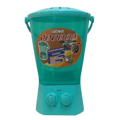 タイマー付きで、一度に最大2kgまで洗えます。半透明容器で洗浄状況が確認でき、蓋に排水口が付いているので中身をこぼさずに水切りが可能です。手袋等の衣類も洗えます。(中国製)