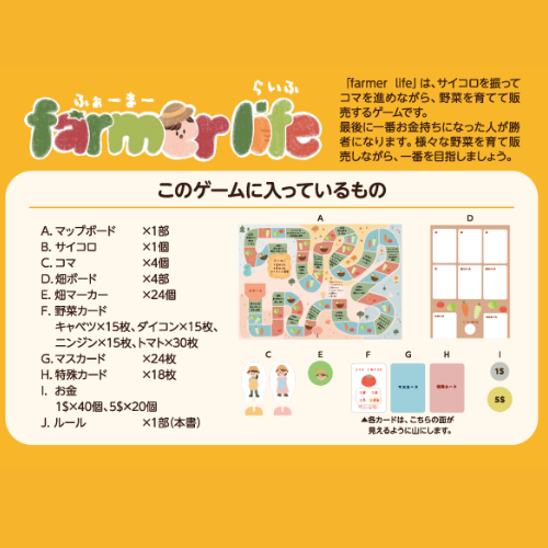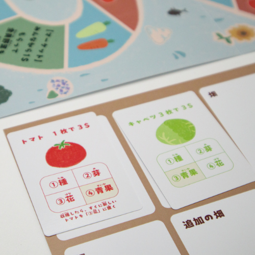 コマを進めながら、野菜を収穫し販売しますが、「水やり」「草刈り」などの栽培促進効果や、「猛暑」「害獣」などの阻害イベントなどが起こる。カードゲーム要素もあり、大人が駆け引きを楽しむプレイも可能となっている。(日本製)
