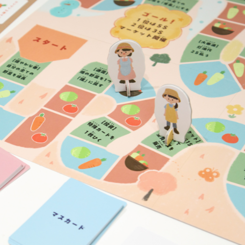 サイコロを振ってコマを進めながら野菜を育てて販売するボードゲームで、普段食べている野菜の栽培過程を学ぶことができる知育玩具。