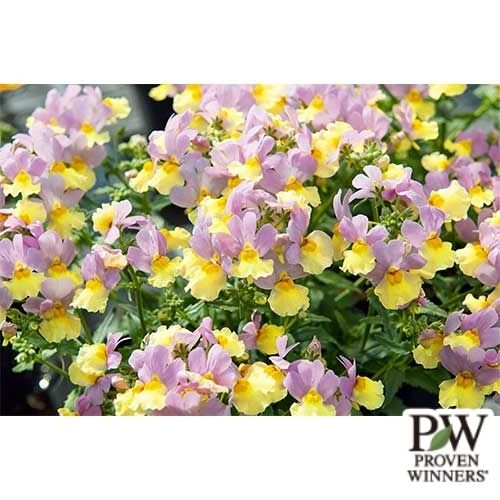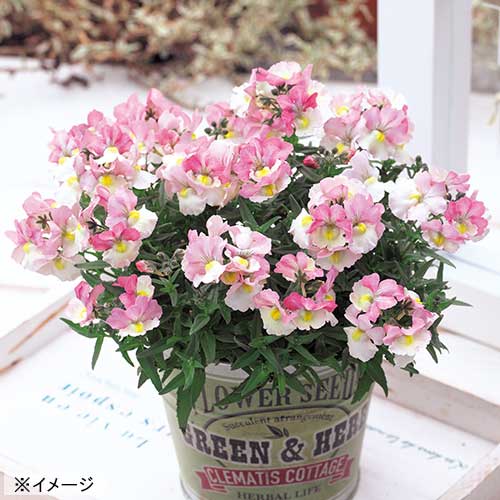 上弁がピンク色、下弁が明るいレモン色のツートンカラーがかわいい。草姿はこんもりとまとまり、株を覆い尽くすほどたくさんの花を咲かせる。秋~冬~春と長期間かわいらしい花が楽しめる。ゴマノハグサ科