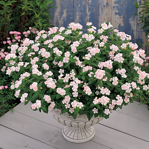 淡いピンク色に中心黄色目花。よく分枝し、短節間なのでこんもりとした株にまとまり、コンパクトながら小輪花がたくさん咲く草姿は見応え十分。分枝力も旺盛でピンチをしなくても株が張るのも特徴。キョウチクトウ科