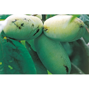 自分の花粉で受粉できる「自家親和性」をもつ品種が多いですが、自分の花粉では受粉しない「自家不親和性」の品種もあります。このような場合も含めて異品種を2本以上植え、その花粉を使う方が受粉率も高くなり、安定した結実が見られます。ポポーは一つの花に多くの雌しべがあるので、受粉すると房状に多くの実をつけることがあります。この場合は、葉数10枚につき1果を目安に摘果することで、大きな果実を得られます。