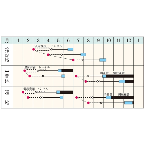 - 花期、収穫期(○○どり)、高さ、収穫重量などの性質は、一般平坦地における適期栽培でのおおよその目安です。
