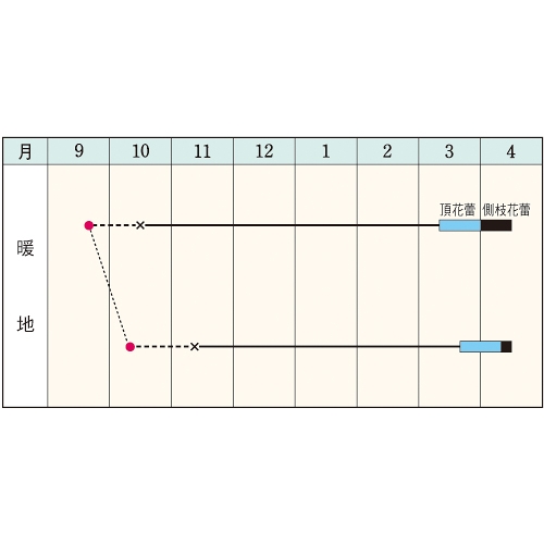 - 花期、収穫期(○○どり)、高さ、収穫重量などの性質は、一般平坦地における適期栽培でのおおよその目安です。