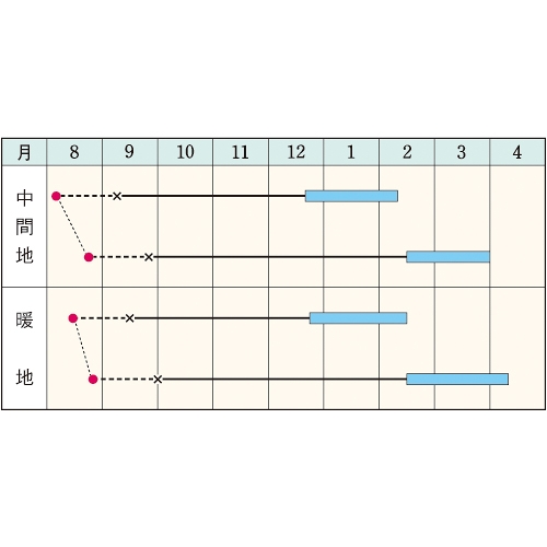 - 花期、収穫期(○○どり)、高さ、収穫重量などの性質は、一般平坦地における適期栽培でのおおよその目安です。