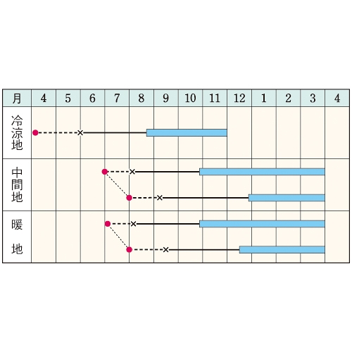 - 花期、収穫期(○○どり)、高さ、収穫重量などの性質は、一般平坦地における適期栽培でのおおよその目安です。