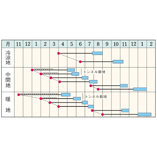 - 花期、収穫期(○○どり)、高さ、収穫重量などの性質は、一般平坦地における適期栽培でのおおよその目安です。