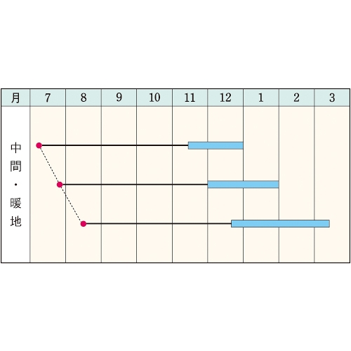 - 花期、収穫期(○○どり)、高さ、収穫重量などの性質は、一般平坦地における適期栽培でのおおよその目安です。