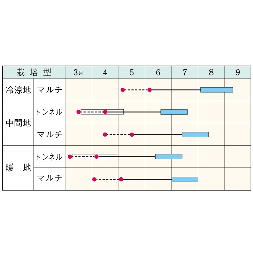※熟期は、露地(マルチ)適期まきでの播種から収穫までの目安日数です。(播種時期や天候により多少のズレが出る場合があります。)