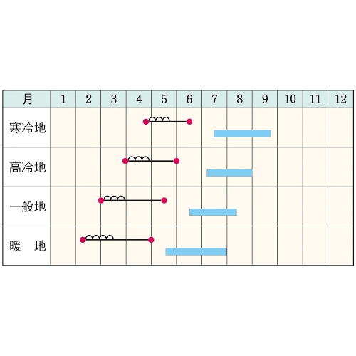 - 花期、収穫期(○○どり)、高さ、収穫重量などの性質は、一般平坦地における適期栽培でのおおよその目安です。