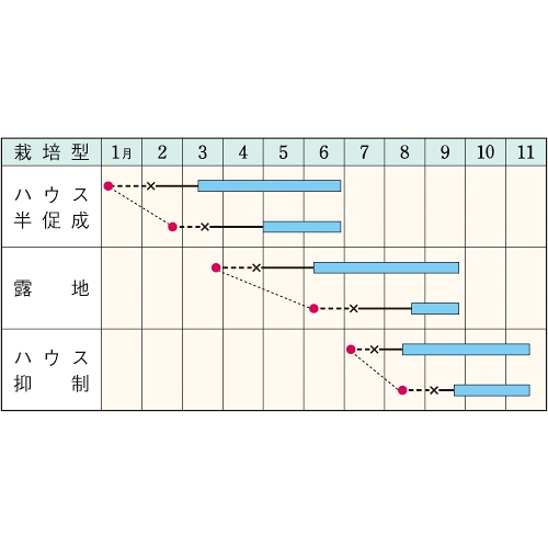 - 花期、収穫期(○○どり)、高さ、収穫重量などの性質は、一般平坦地における適期栽培でのおおよその目安です。