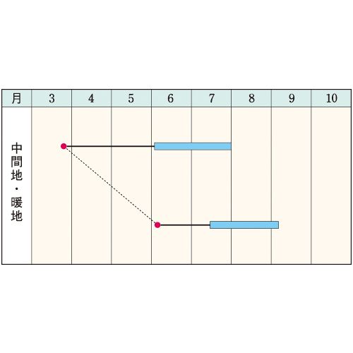 - 花期、収穫期(○○どり)、高さ、収穫重量などの性質は、一般平坦地における適期栽培でのおおよその目安です。