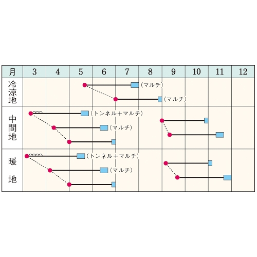 - 花期、収穫期(○○どり)、高さ、収穫重量などの性質は、一般平坦地における適期栽培でのおおよその目安です。
