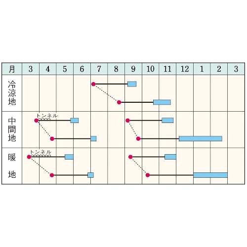 - 花期、収穫期(○○どり)、高さ、収穫重量などの性質は、一般平坦地における適期栽培でのおおよその目安です。