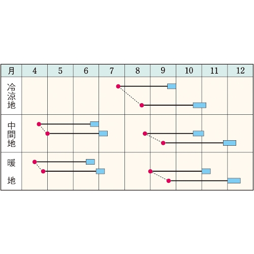 - 花期、収穫期(○○どり)、高さ、収穫重量などの性質は、一般平坦地における適期栽培でのおおよその目安です。