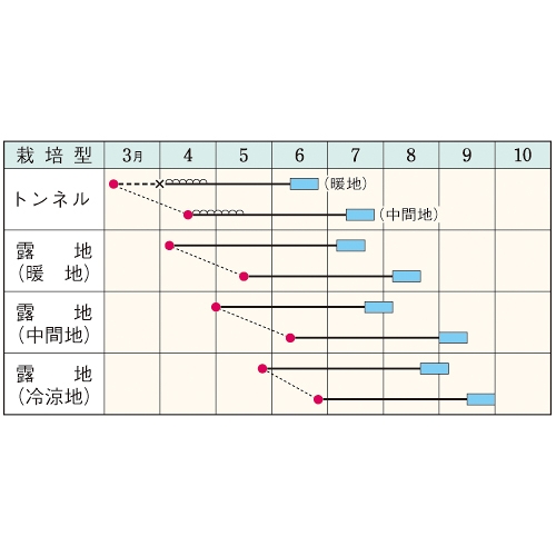 - 花期、収穫期(○○どり)、高さ、収穫重量などの性質は、一般平坦地における適期栽培でのおおよその目安です。