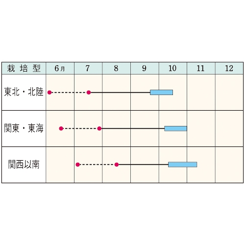 - 花期、収穫期(○○どり)、高さ、収穫重量などの性質は、一般平坦地における適期栽培でのおおよその目安です。
