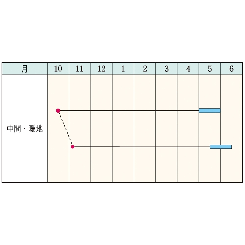 - 花期、収穫期(○○どり)、高さ、収穫重量などの性質は、一般平坦地における適期栽培でのおおよその目安です。