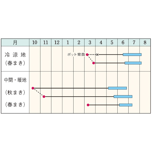 - 花期、収穫期(○○どり)、高さ、収穫重量などの性質は、一般平坦地における適期栽培でのおおよその目安です。