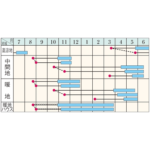 - 花期、収穫期(○○どり)、高さ、収穫重量などの性質は、一般平坦地における適期栽培でのおおよその目安です。