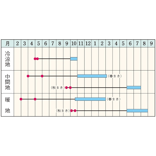 - 花期、収穫期(○○どり)、高さ、収穫重量などの性質は、一般平坦地における適期栽培でのおおよその目安です。