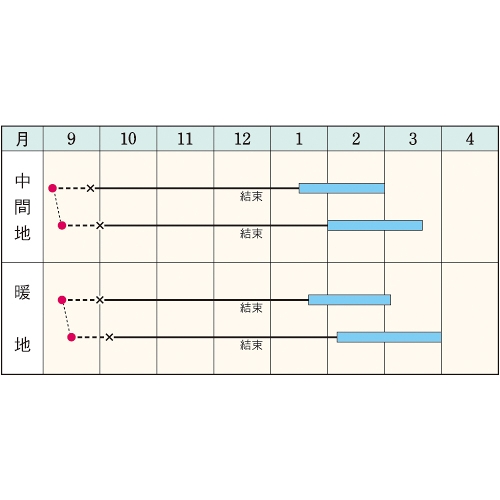- 花期、収穫期(○○どり)、高さ、収穫重量などの性質は、一般平坦地における適期栽培でのおおよその目安です。