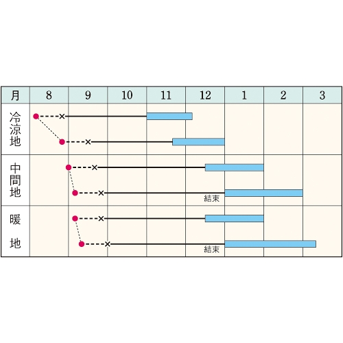 - 花期、収穫期(○○どり)、高さ、収穫重量などの性質は、一般平坦地における適期栽培でのおおよその目安です。