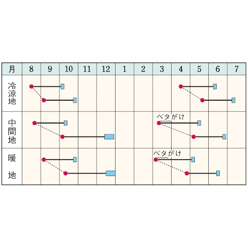 - 花期、収穫期(○○どり)、高さ、収穫重量などの性質は、一般平坦地における適期栽培でのおおよその目安です。